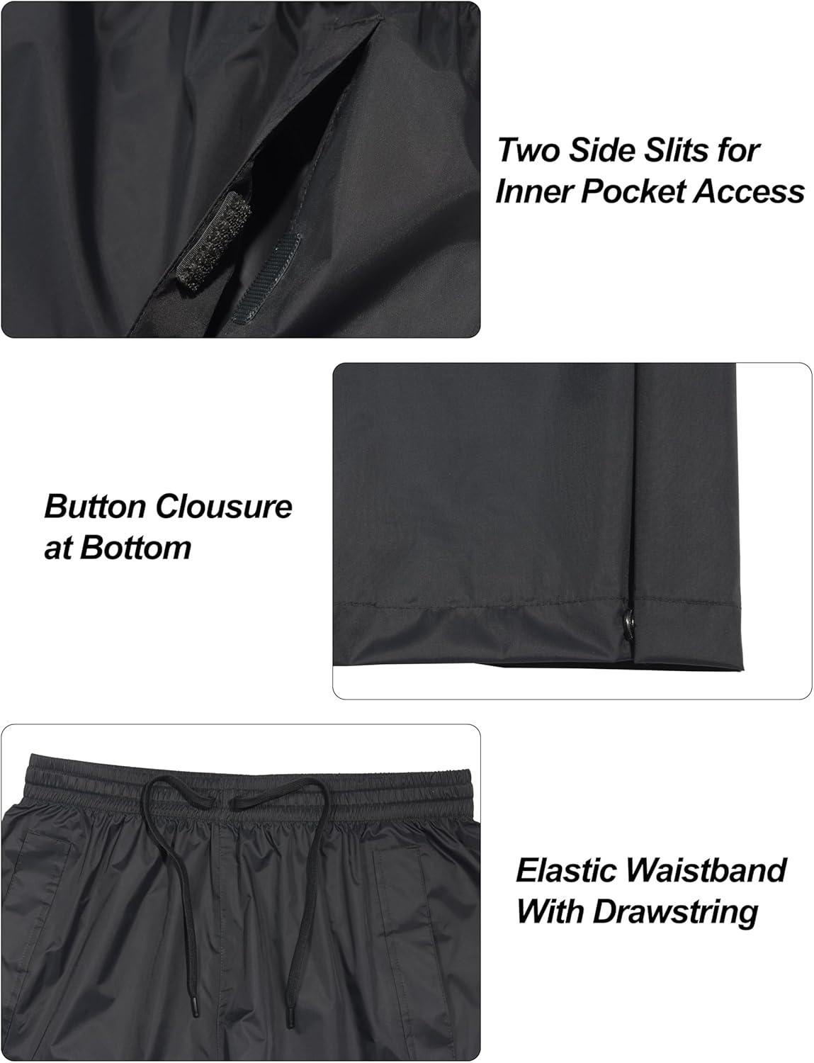 Functional Design of Legs: The lightweight rain pants have sturdy button closures at the bottom of the legs allowing for width adjustment for different suits and occasions.