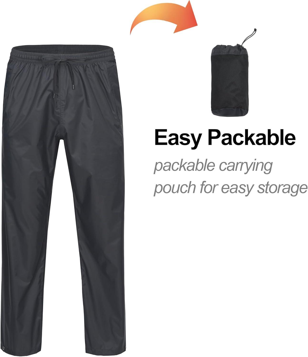 Lightweight and Packable: The rain pants are lightweight, and it also comes with a storage bag for easy storage of rain pants
