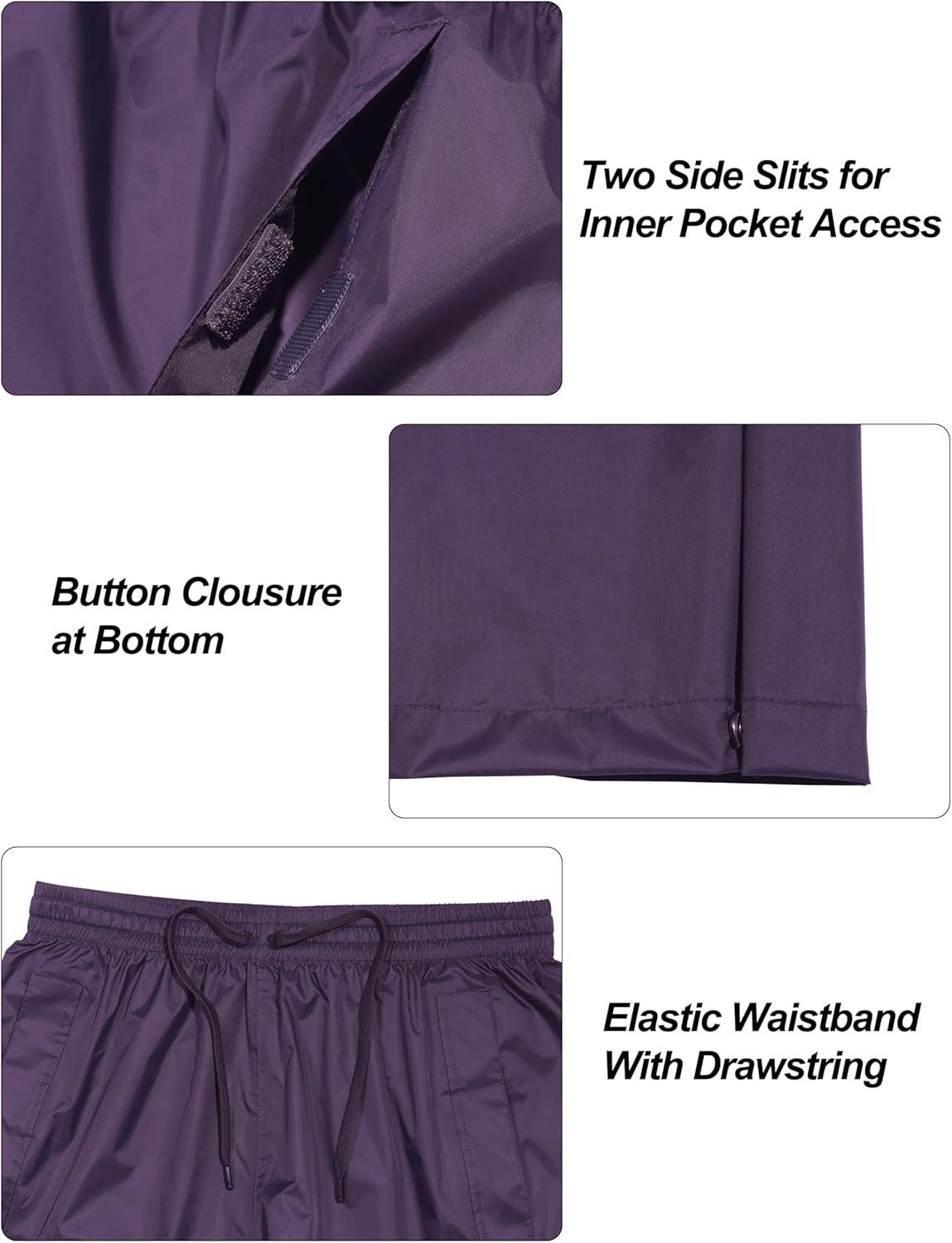 Functional Design of Legs: The lightweight rain pants have sturdy button closures at the bottom of the legs allowing for width adjustment for different suits and occasions.
